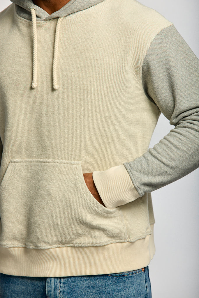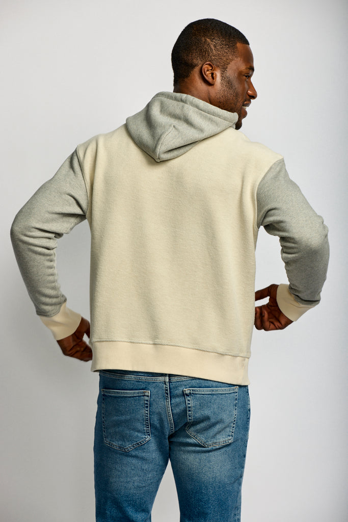 Oatmeal loopback body with heather grey sleeves and hood